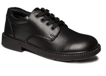 - Black leather/leather-look shoes with a flat defined heel.